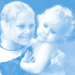Let's return to our typical scene of a blonde girl wearing a magenta and blue T-shirt, holding a blonde baby boy.
