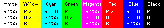 The third file combines a grey scale with electronically generated colour bars, just like the ones used in television. The saturation of the light primary colours - red, green and blue - is the maximum you can generate in the computer: level 255. The light secondary colours, which are also the pigment primaries - cyan, magenta and yellow, are also at maximum saturation. White is made up of equal and maximum amounts of all the light primary colours. Black has zero amounts of the three primaries. Here's how the colour bar colours are made up: