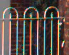 A greatly enlarged section of the railing between the front door and gate in the picture at the top of this page. One of the most difficult subjects for this kind of digital camera to interpolate.