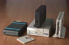 Back row, left to right: High Density 3.5 inch floppy diskette (1.4MB), SyQuest 44MB, DAT tape (2GB).