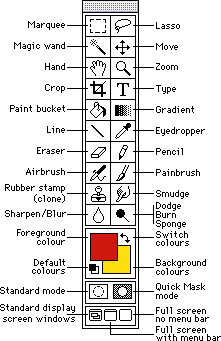 At the top of the screen is the Photoshop menu bar, to the left the toolbox with a range of tools allowing you to select, paint, edit and view images. Below these are displays to show the foreground and background colours, switch to Quick Mask mode, and controls to change the Screen display modes.