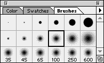 Select the Rubber Stamp tool (just press S) and display the brushes menu by selecting Window>Display Brushes from the Menu Bar. Use the Zoom tool to enlarge a part of the image with a crack or tear.